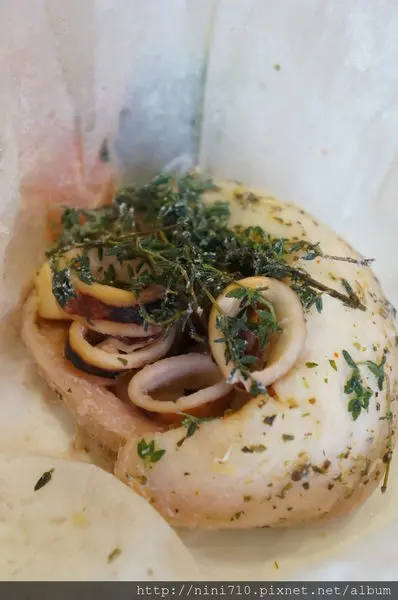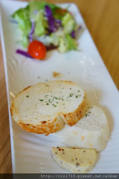滾著帕瑪森起司口味的麵包烤的香酥,搭配上特製的芥末子奶油,蠻不錯,雖然小塊了點,旁邊有搭一些生菜沙拉佐酸甜橙醋醬