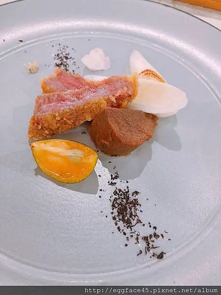 油油亮亮又帶點焦糖化的色澤烙印在粉嫩的日本和牛上,