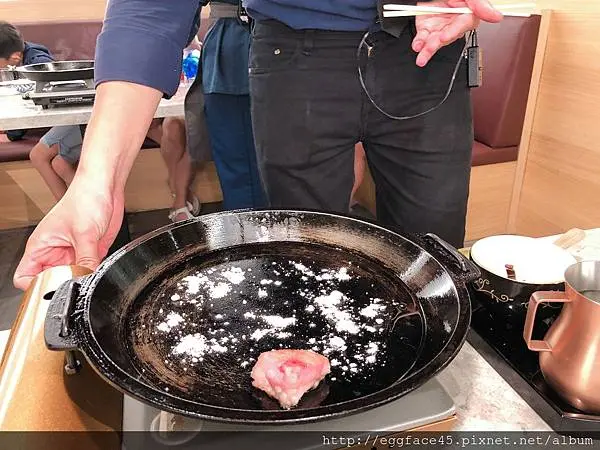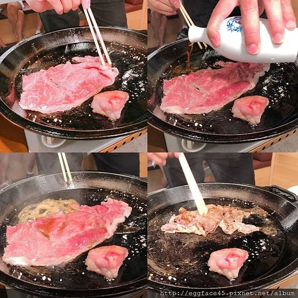 在吃壽喜燒前,店家會先煎烤一塊招待的A5和牛,讓我們認確肉質。