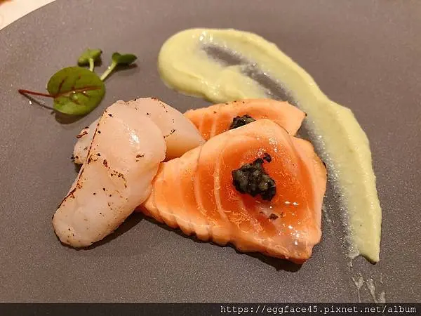 3分熟軟香的鮭魚,加上微微炙燒後鮮甜的干貝,