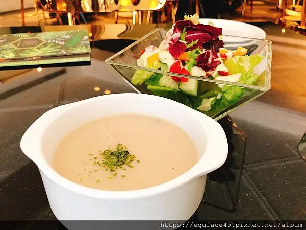 百香果優格醬沙拉:新鮮爽脆的生菜,搭上酸香滑順的百香果優格醬,夏天吃起來非常清爽開胃。 奶油蘑菇濃湯:每日例湯都不相同,今日的奶油蘑菇濃湯香滑濃順,主廚特別添加了馬鈴薯來增加湯濃郁感和滑順感。