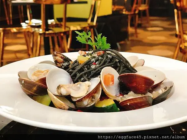 滿滿的新鮮蛤蜊、脆嫩櫛瓜、爆香的蒜片,融合在這一盤墨魚麵中,