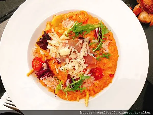 品嚐一口,番茄奶油的酸香口感融合在義大利米中,