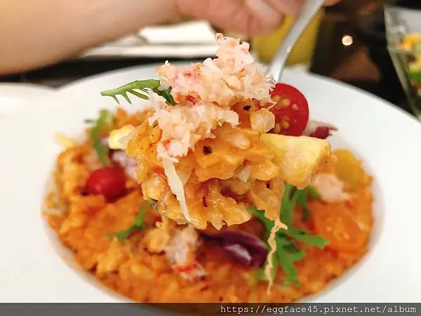 燉飯裡有滿滿的松葉蟹肉、劍筍、蘆筍、皇帝豆,