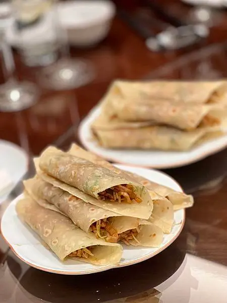 薄片的捲餅皮裡,包著京醬豬肉絲,