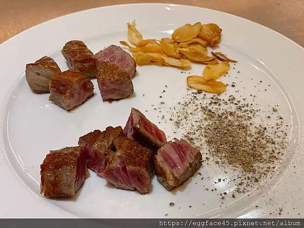 煎好的牛排,師傅會放在有溫熱的瓷盤上保溫,並加入一些蒜片,