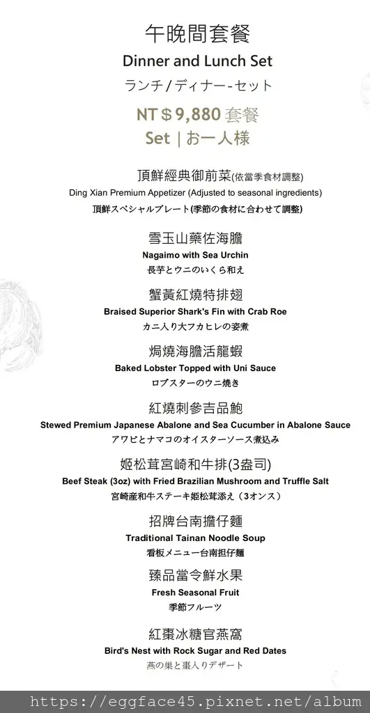 精緻桌菜($29800、38800), 午、晚間套餐($1980、2680、3880、5880、9880、12880) 也有素食套餐、穆斯林套餐、單點菜色可選擇。