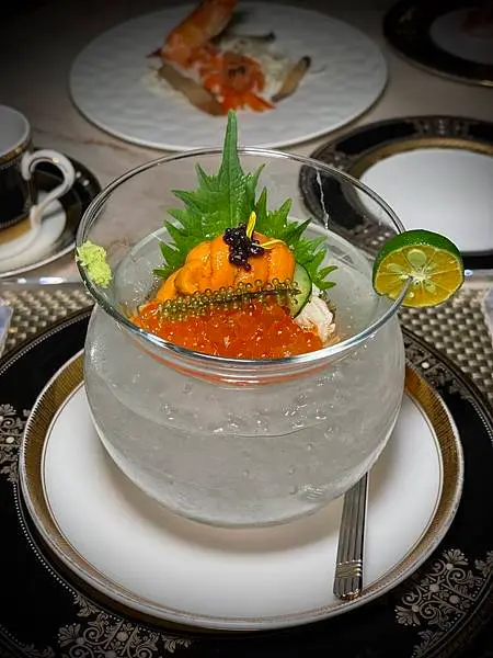 上頭堆疊著馬糞海膽、鮭魚卵、魚子醬,