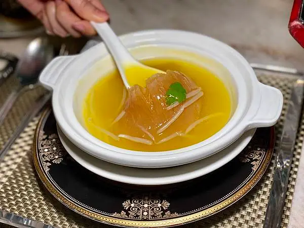大片的排翅,浸泡在精心熬製的金黃湯汁中,
