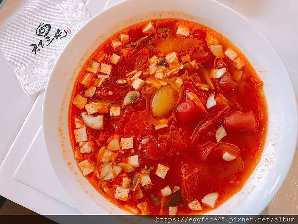 紅通通的湯底是由四種蕃茄和多種菇類熬製而成,