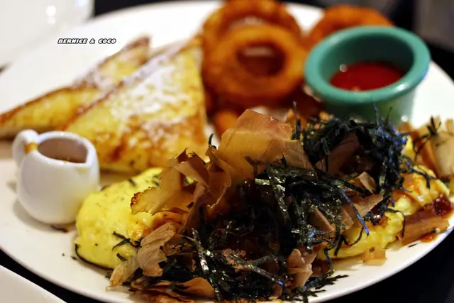歐姆蛋上加了柴魚和海苔搭上照燒醬汁