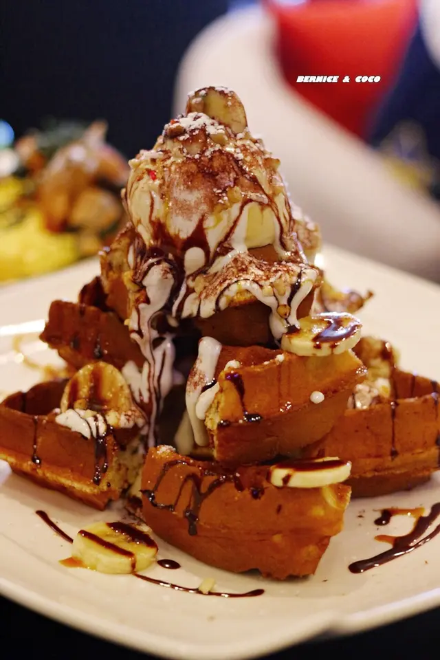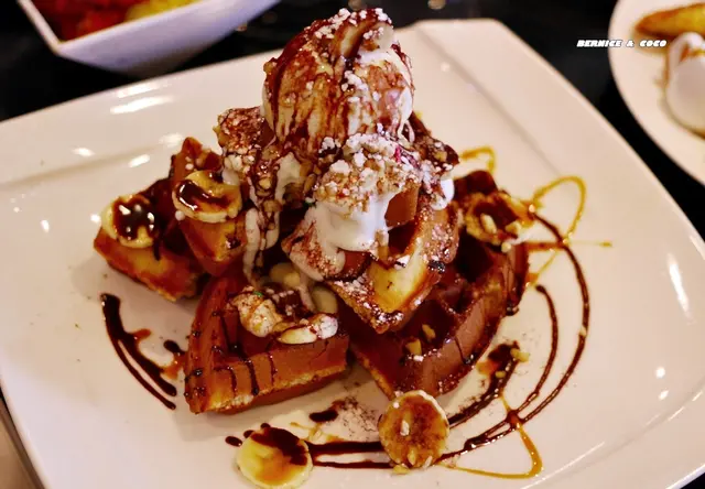 冰淇淋+香蕉+巧克力醬+核果+鬆餅