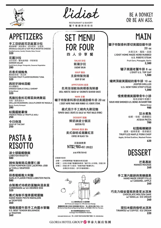 驢子餐廳這次推出的四人套餐堪稱史上CP值最高!四個人只要2980+10%!套餐包含:凱薩沙拉/主廚特製例湯/炙烤澎湖軟絲與椰香海鮮醬/驢子特製香料厚切美國肋眼牛排20oz/義式茄汁手工豬肉丸雞冠麵/鮮奶油波士頓派/美式咖啡或錫蘭紅茶,想得到這麼殺的優惠當然還是要小小的付出囉!只要先在驢子餐廳FB粉絲專頁按在加入並在『驢子四人分享餐』活動貼文下方留言:『揪團來驢子餐廳吃肉』並標記四名朋友就可以享此優惠囉!