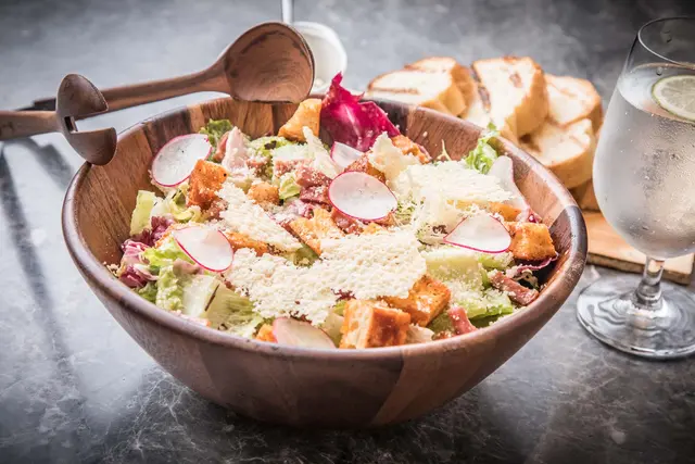 凱薩沙拉份量超有誠意,用大木碗盛裝,生菜上刨上了起司及鹹香的培根碎,生菜口感爽脆搭配特製的凱薩醬,上面撒上有著濃郁鹹鮮的碎培根跟烤過的麵包丁超加分