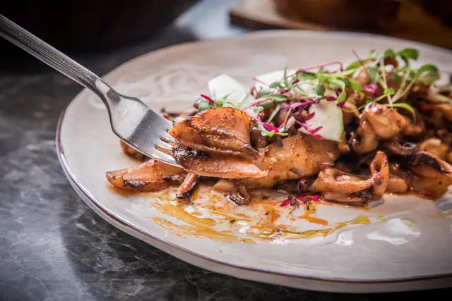 超級厲害的前菜!主廚特別選用澎湖現流軟絲以自製辣油沙茶醬醃漬一天,再經JOSPER 烤箱烘烤,讓軟絲帶有煙燻風味,再加入時令水果(今天是芭樂),讓味覺感受多了分清爽果香,鮮香的椰香海鮮醬更加提升軟絲鮮甜脆口的層次風味,吃完前菜一整個胃口大開!
