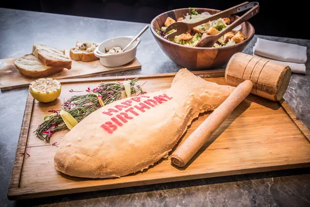 驢子餐廳主廚創意推出「慶祝魚」,將紅蘿蔔、洋蔥、黃檸檬片填入鮮魚內,再以海鹽包覆、香烤,咬咬剛好是這個月的壽星,所以主廚在海鹽上寫下生日快樂
