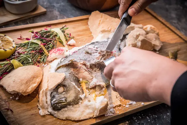 享用前必須先以小槌子輕輕敲開,象徵敲開歡樂、敲開好運,撥開鹽塊,一整尾鮮魚就現身了,魚的種類會隨著每日漁港採買不同,今天是黃雞魚