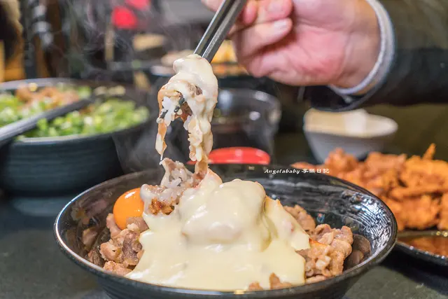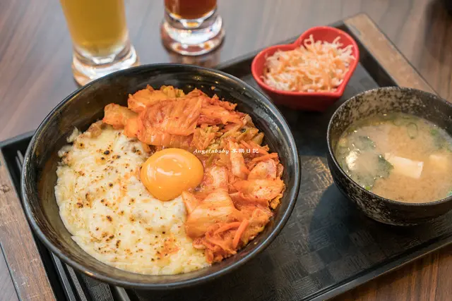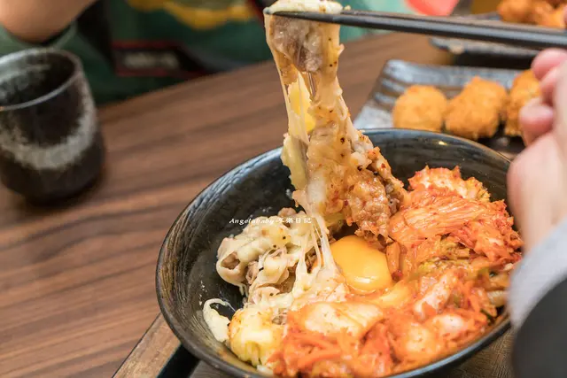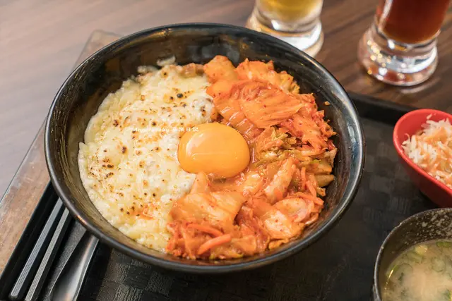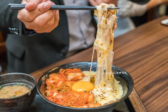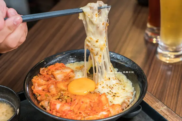 韓美新丼,一邊為韓式泡菜、一邊為牛五花上頭大量香濃起司(炙燒口感更棒)
