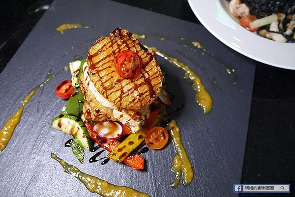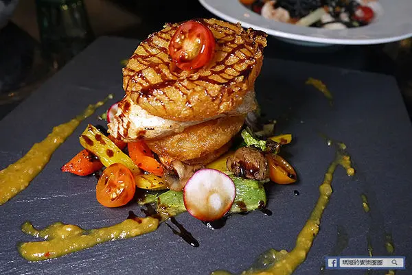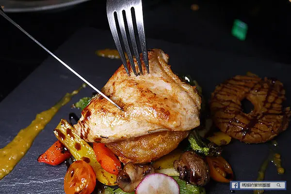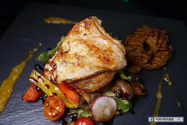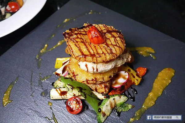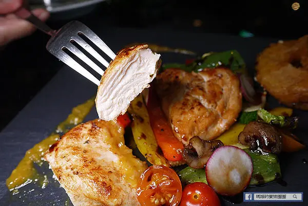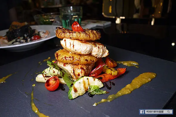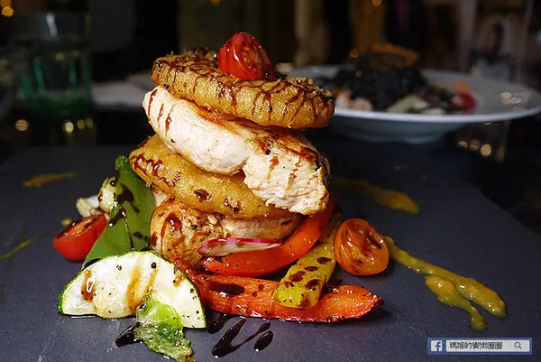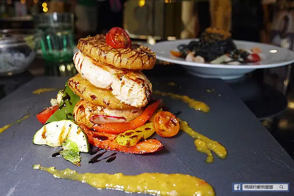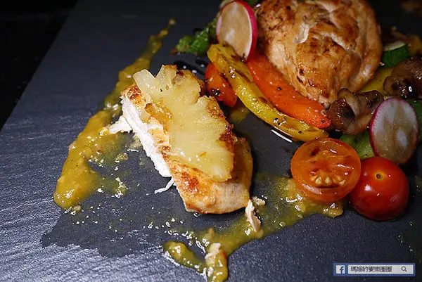厚實的雞肉和鳯梨雙雙堆疊成塔,旁邊再加上櫛瓜、甜椒、玉米荀、蘑菇和小蕃茄等季節時蔬,多彩繽紛的視覺感,讓人打開味蕾。