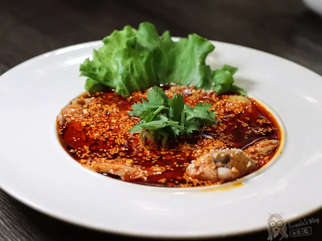看起來紅通通的口水雞是經典川菜菜色,但其實這到口水雞的辣度很低,完全沒有殺傷力,不吃辣的人也可以放心吃。用雞腿肉吃起來蠻鮮嫩的,辣油本身香氣不算突出但一些帶點麻麻的感覺,還有加上碎花生與芝麻的香氣,很開胃。