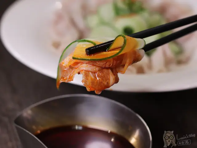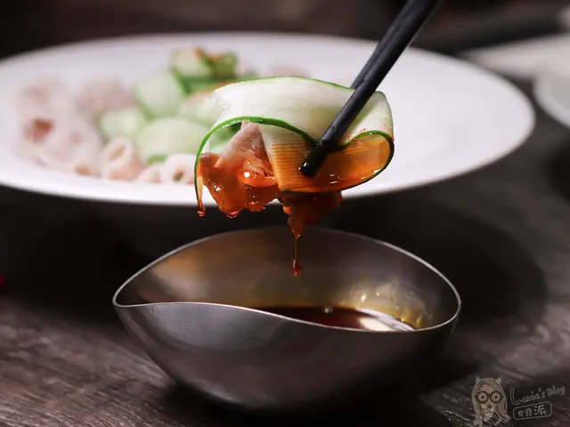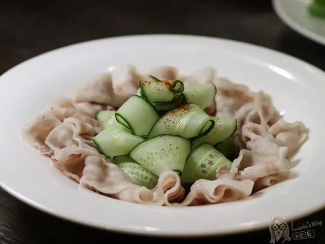 將白肉與黃瓜川燙後擺盤,旁邊附上一碗辣油,可以沾著吃