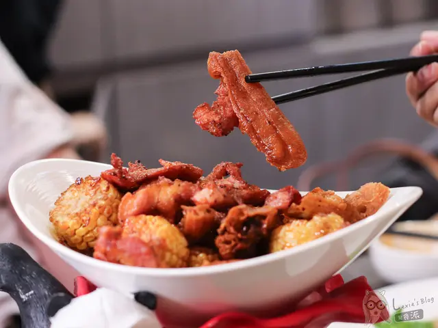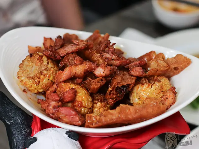 炸倆很出色,口感夠焦脆,咬起來ㄎㄠㄎㄠㄎㄠ的脆口聲音此起彼落,豬肉的部分則有些過鹹,務必配著飯吃,是一道香氣與口味都比較重的菜色,玉米也一樣有沾裹著香辣的氣味,但玉米可能不太適合油炸,吃起來比較乾,較可惜。