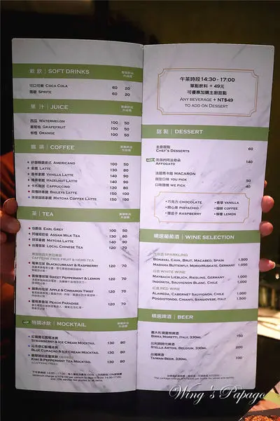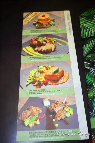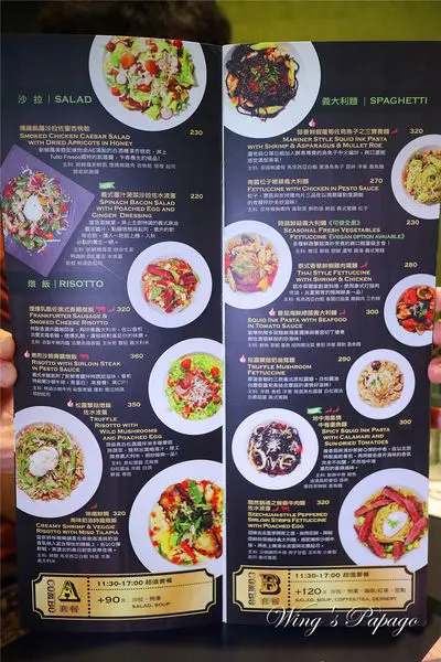 Menu綠色封面充滿綠色叢林感,餐點有沙拉、燉飯、義大利麵、pizza、飲品、甜點等,