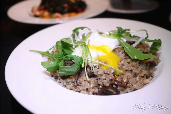 再加入正統義大利米拌炒燉煮,最後再放顆半熟水波蛋及灑上芝麻葉、起司。