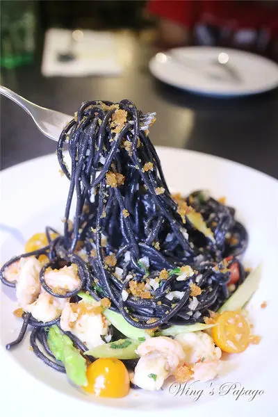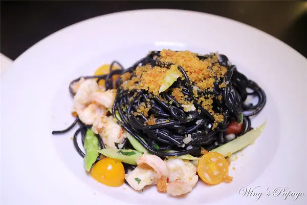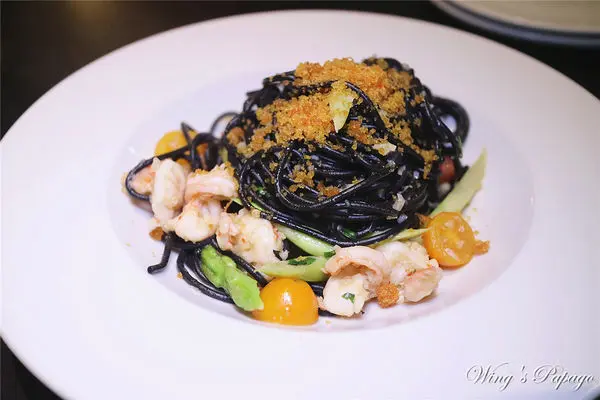 嫩黃色烏魚子猶如閃亮寶石點綴在墨魚麵上,鮮蝦飽滿Q彈、蘆筍脆嫩,