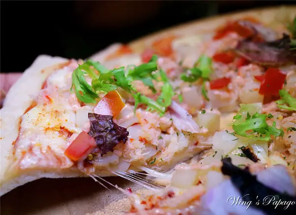 餅皮舖上洋芋丁、松葉蟹肉絲、特調明太子醬、起司、蕃茄紅醬、時蔬等餡料烘烤,