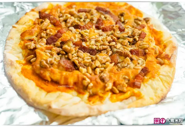 這款咖哩風味培根堅果披薩是翡冷翠商城網路限定款,餐廳內用可是吃不到喔!主廚特別將紅醬加上咖哩粉,加上松子/核桃和厚切培根,健康養生!