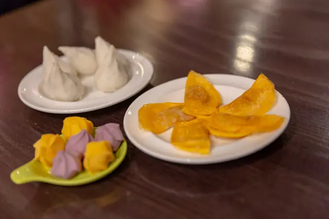 這山藥芋泥球造型就像奶油吹嘴小花,裡頭包著濃郁芋泥,外皮Q軟內裡軟綿,非常喜歡的口感 ; 有個性的刀削麵吃起來彈牙,瓦法奇朵的刀削麵含這優點外,入鍋後的刀削麵趴附滿滿紅湯,帶勁夠味