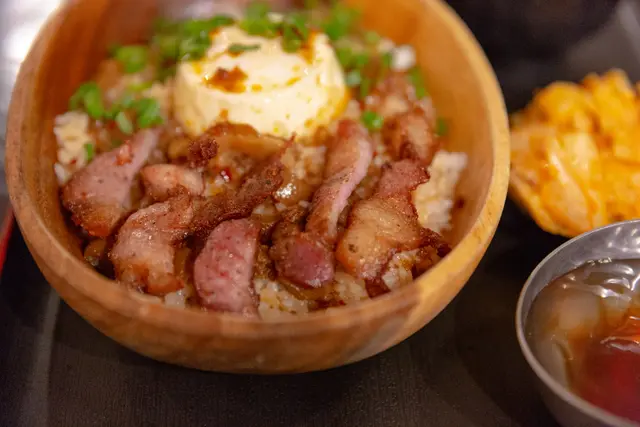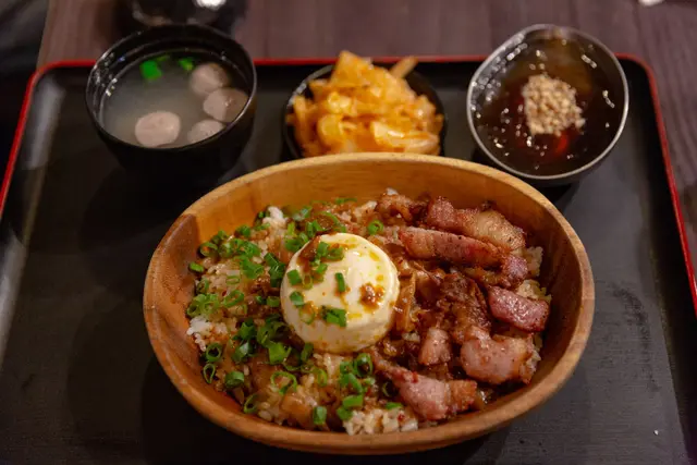 最最推薦鹹豬肉銷魂飯的選擇,選用油花均勻的三層肉,肉嫩新鮮,中間還有一顆半熟蛋,用叉子畫開後,蛋黃汩汩流出讓人垂涎三尺