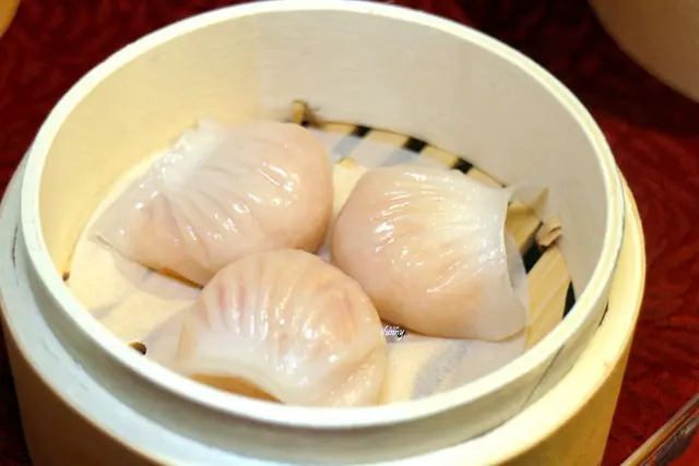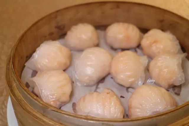 港點中不可或缺的就是燒賣了!這採用豬後腿肉製成的內餡,上面淋上花枝漿並撒上鮮橘色的魚子點綴。咬下後盡是豬肉的鮮美多汁,還有脆口的花枝及跳躍的魚子,每咬一口都是幸福滋味啊!