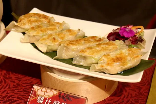 這鍋貼外表煎得酥香,加上厚實的外表,實在太令人垂涎!內餡有豬肉、蝦仁、高麗菜、金針菇、韭黃再加入雞高湯。一咬下後薄脆的餃皮很討喜,濕潤的內餡有著蔬菜的清甜。這樣來上一盤,都沒問題的!