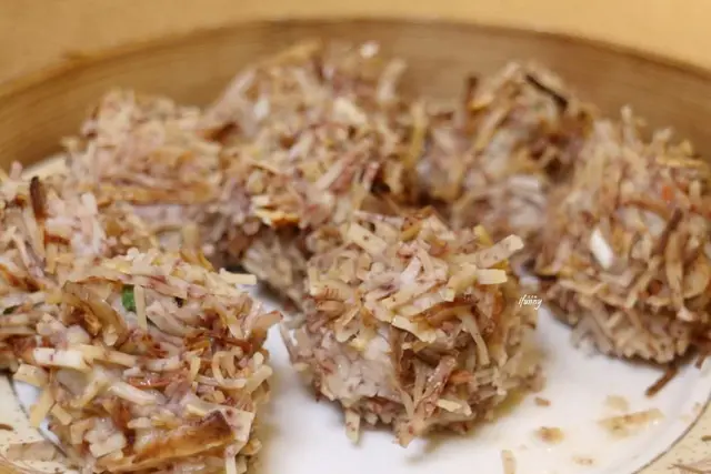 萬師傅先手工切芋頭絲油炸,再炸蒜酥,利用蒜香來提芋頭味。芋頭絲內包覆著豬絞肉、蝦仁、青蔥及蒜酥。吃來並非厚重的蒜味,而是清爽型,加上濃郁的芋頭香氣,這丸子吃來的口感很有層次。