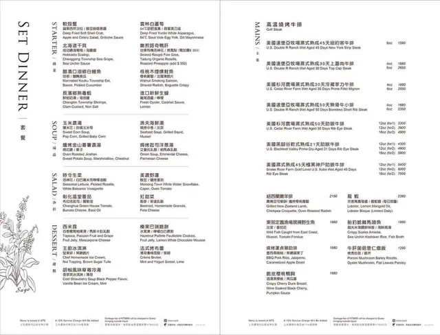 前菜、湯品、沙拉、主食最後附上甜點與飲品