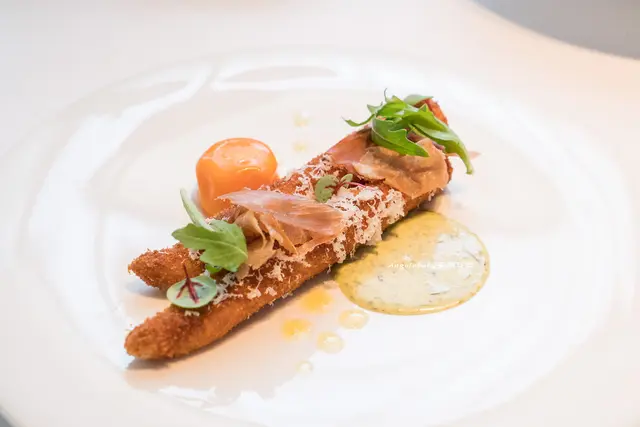 酥脆的麵衣使用自家的新鮮麵包研磨成粉,水嫩多汁搭配舒服的蛋黃液、盤上的醬汁