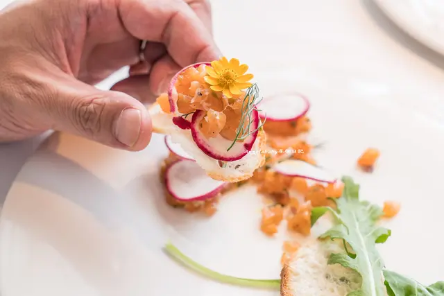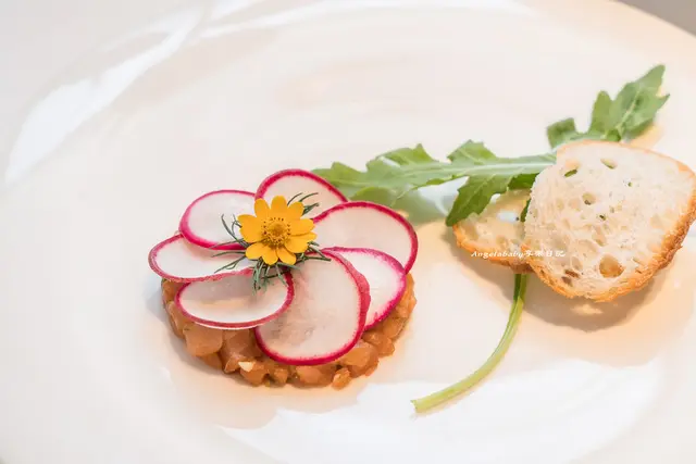搭配酥炸櫻桃蘿蔔、法式薄脆餅以及提出整體風味的迷迭香,一次放入口中滿滿幸福泡泡