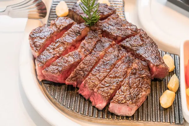 肋眼牛排的油脂分布均勻,外層微酥、切成條狀厚實過癮
