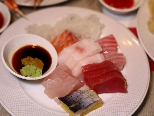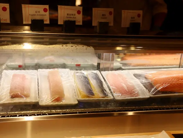 日料區備有五種新鮮的生魚片,油脂豐富的鮭魚是最受歡迎的。