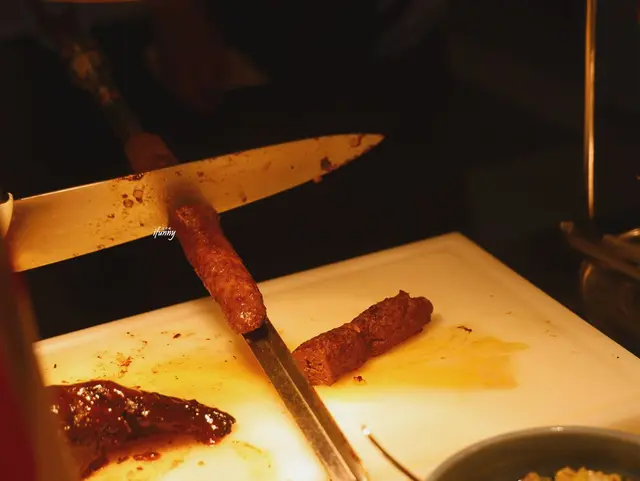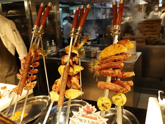 加拿大牛肉串採用牛胸肉拌入孜然、豆蔻、紅椒粉等多達六種香料後醃製入味,然後需將牛肉薄鋪一層在烤肉串上,以利後續炭烤時可受熱均勻,接著放入西班牙Josper Grill烤爐,以近300至400度大火高溫燒烤5至10分鐘,快速將肉汁鎖在牛肉裡面,炭烤後的香氣逼人,充滿異國風味的香料迴盪唇齒間,令人回味無窮!