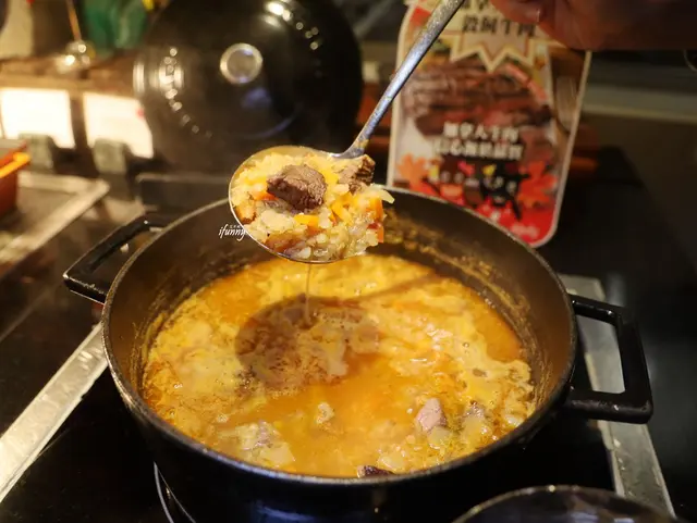 這是一道耗時的功夫菜,需先費時燉煮牛肉汁,以牛骨、牛肉、牛筋、番茄、洋蔥、蔬菜及香料先熬煮2至3天,將肉汁濃縮至三分之一才行。然後再以濃縮肉汁燉煮加拿大牛肉、馬鈴薯及胡蘿蔔,整整4個小時讓牛肉軟爛入味。為了添增口感及風味,再蓋上酥皮烤至上色酥脆,香酥口感搭配濃郁風味的軟嫩牛肉,是深受好評的牛肉料理。