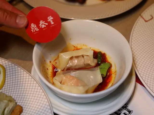 每張餐桌依人數有鼎泰豐的餐牌,每人憑餐牌可換一樣餐點。蝦肉飽滿醬香十足的紅油抄手,果真令人滿意。