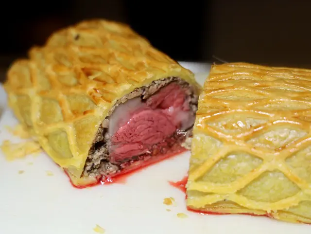 威靈頓牛排是一道做法非常繁複,耗時也費工的經典英國名菜。須先牛肉下鍋香煎上色,除了增添風味之外,也是為了鎖住肉汁;然後塗上一層鴨肝蘑菇泥,再包裹一層帕瑪火腿,最後用酥皮包裹完整後,最外層再均勻刷上蛋黃液,放入近250度高溫的烤箱,焗熟10至15分鐘,出爐後靜置10分鐘。成品一切開後,就能發現鮮嫩多汁的剖面,搭配外表金黃酥脆的酥皮,簡直就是太犯規了!
