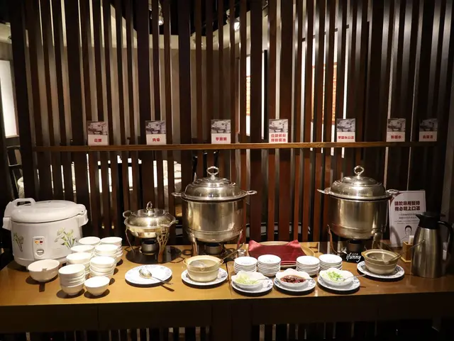 這次無菜單最大的特色是芋頭米粉湯、芋頭粥、滷肉飯、白飯無限供應,一旁有蔥末、芹菜末及辣椒醬油供搭餐。取餐區另備烏龍茶、開水可供自取。