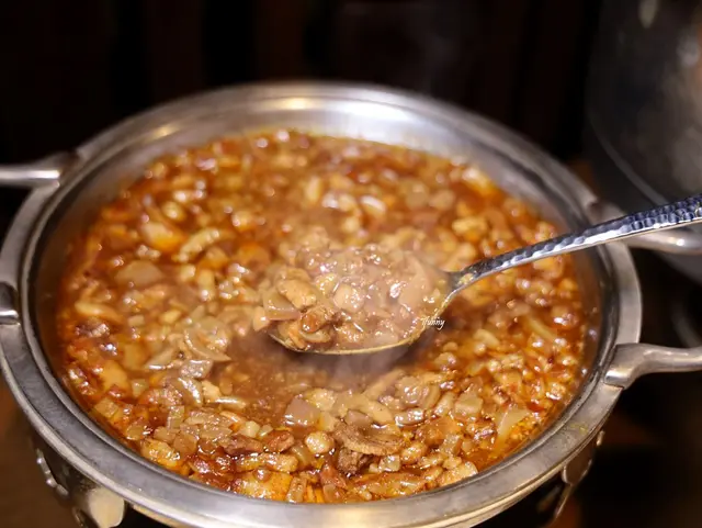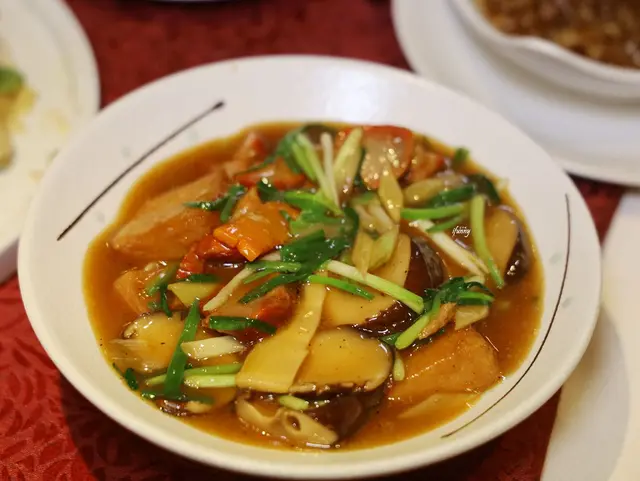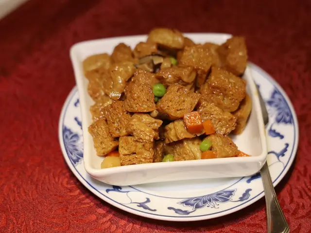 將雞蛋豆腐炸至外酥內軟,再加入菇類、筍乾、胡蘿蔔等,拌上珠蔥爆香過的特製醬汁,勾了薄芡讓食材更入味,淋點醬汁在白飯上,簡直就是白飯殺手。