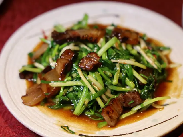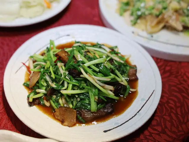 主廚先爆香蒜頭和蔥白,再加上臘肉和珠蔥、辣椒翻炒,臘肉的鹹香混著淡雅爽脆的珠蔥,鹹香脆口又有著微辣感,相當地下飯。