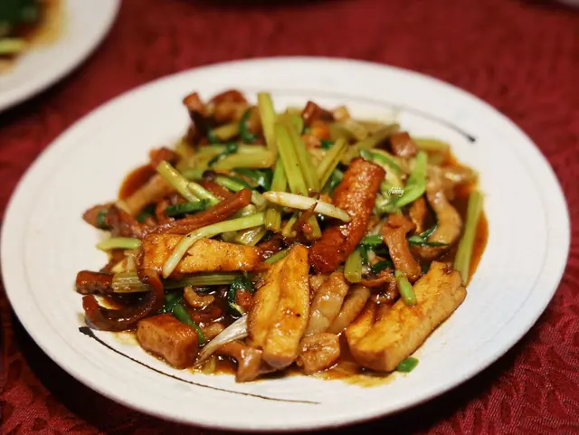 客家料理中常見的家常菜。五花肉、乾魷魚、豆干為主角,再加上珠蔥、芹菜拌炒。最喜歡魷魚的嚼勁,醬香入味,搭配米粉或粥也很搭。