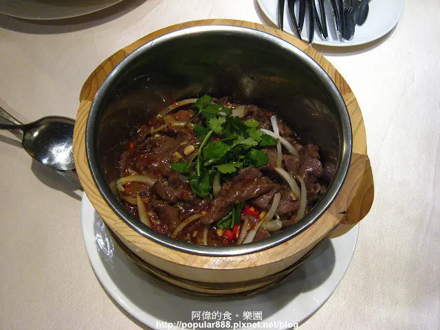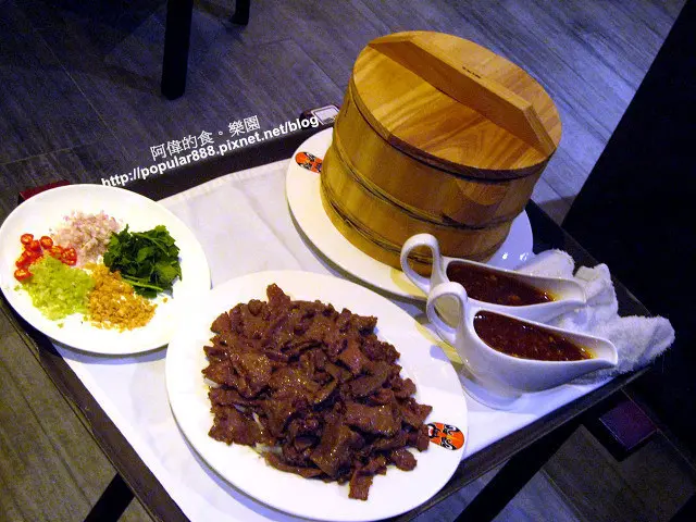 以五色佐料與牛肉片加上醬汁,一起放入高熱的木桶中